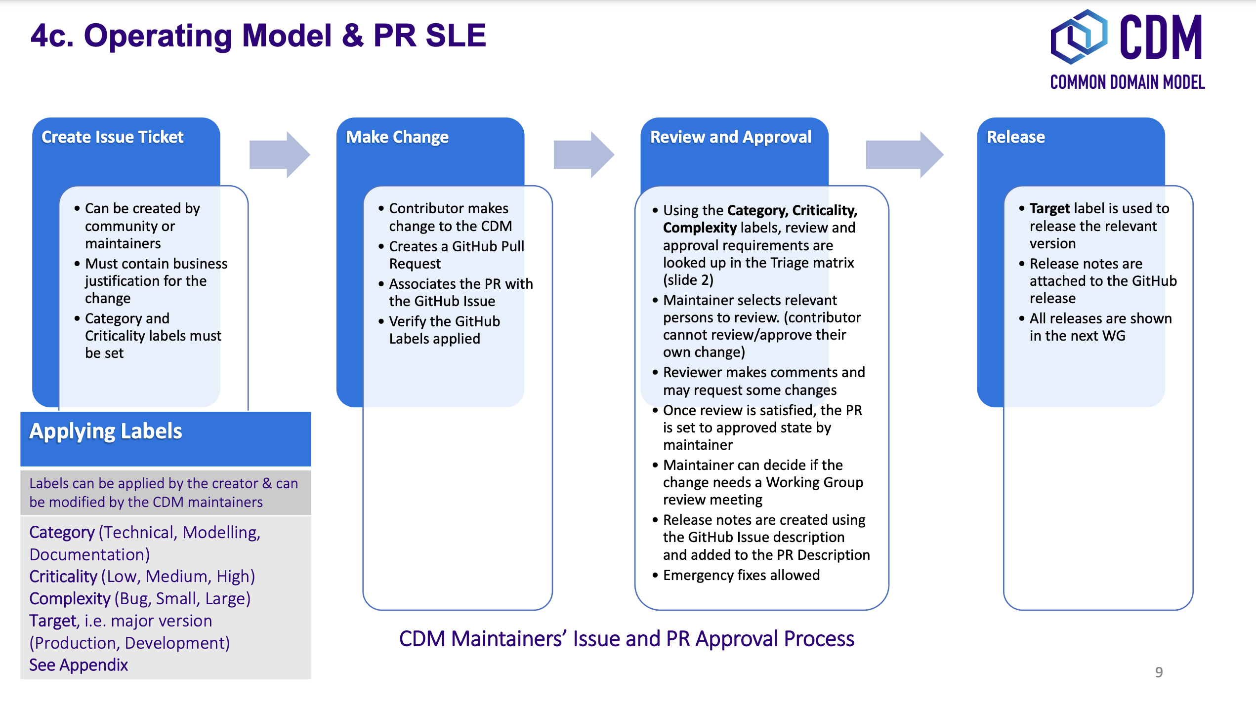 - Maintainers of the CDM Steering Working Group will approve merging of the proposed “Pre-Draft” changes (coming from other Working Groups or otherwise from community) into the repo.